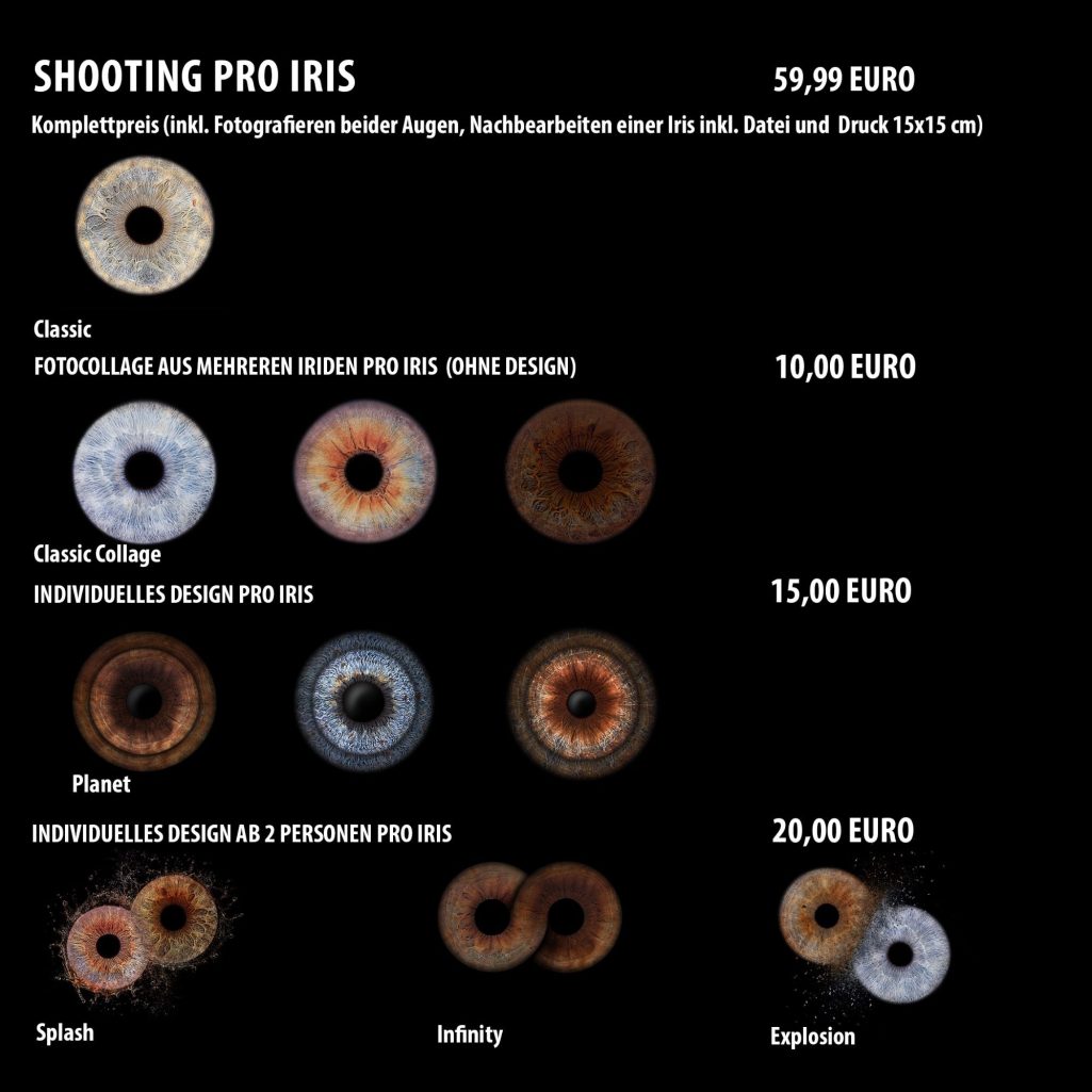 - Verborgene Schönheit entdecken: Die Iris eines Menschen erzählt eine Geschichte – von Emotionen, Lebenserfahrungen und Individualität. Mit Iris-Fotografie können Sie die verborgene Schönheit und Details Ihrer Augen einfangen und sich von einer ganz neuen Seite erleben.